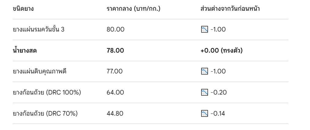 - ยางแผ่นรมควันชั้น 3 (ไม่อัดก้อน) ปรับลดลงอีก -1.00 บาท มาอยู่ที่ 80.00 บาท/กก.