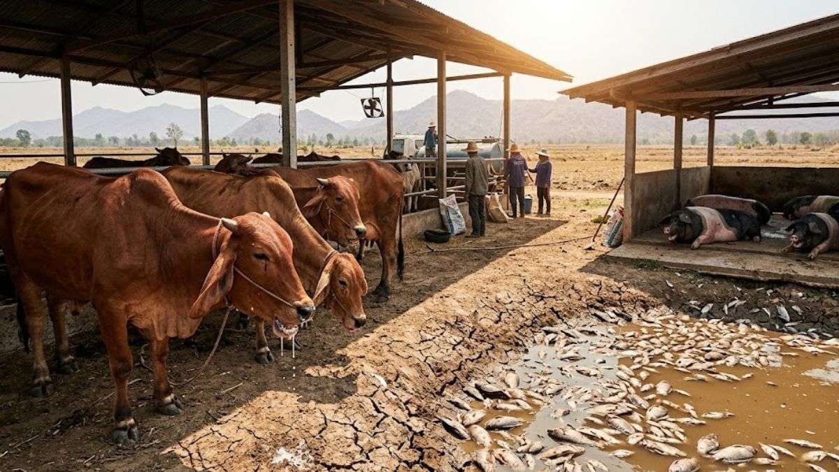 - ปศุสัตว์และสัตว์น้ำทยอยตาย: ปศุสัตว์ส่วนใหญ่จะเริ่มเกิดภาวะเครียดเมื่ออุณหภูมิแตะ 25 องศาเซลเซียส (และต่ำกว่านั้นสำหรับสุกรและไก่ที่ระบายความร้อนทางเหงื่อไม่ได้) สัตว์จะหลบในร่มเงา กินน้อยลง หากร้อนสะสมนานๆ จะนำไปสู่ระบบย่อยอาหารล้มเหลว อวัยวะหยุดทำงาน และช็อกตาย นอกจากนี้ยังทำให้ผลผลิตและคุณภาพน้ำนมลดลง ส่วนในภาคประมง ปี 2567 มหาสมุทรทั่วโลกกว่า 91% เผชิญภาวะคลื่นความร้อนทางทะเล ทำให้ออกซิเจนในน้ำลดลงจนปลาเกิดภาวะหัวใจล้มเหลว